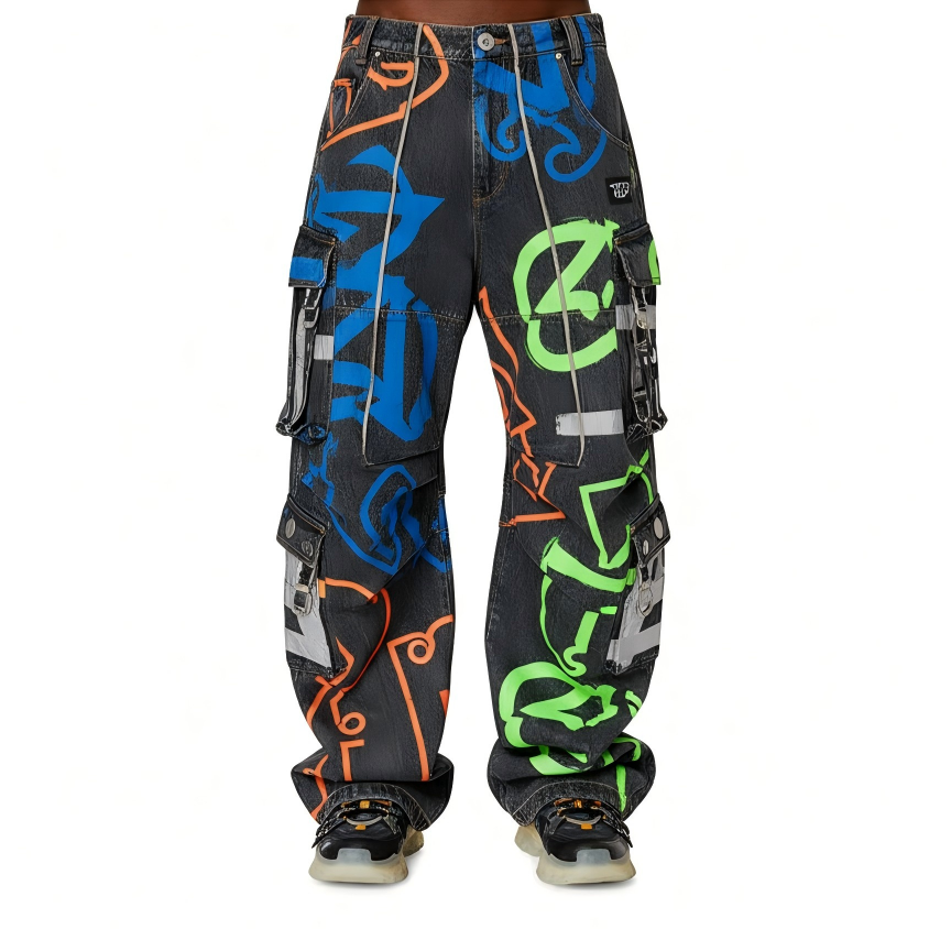 - Core techniques to validate: heavy acid/stone wash base, high-density graffiti print application, reflective accents, and contrast topstitching that visually exposes construction accuracy.