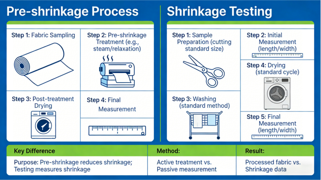 When a supplier says “Sanforized” or “pre-shrunk,” the correct response is: “What residual shrinkage was measured after pre-shrinkage treatment, using what test method, with what wash and dry conditions?” The label “pre-shrunk” is a statement that a process was performed. It is not a statement about the remaining dimensional change. Those two things need to be addressed separately.