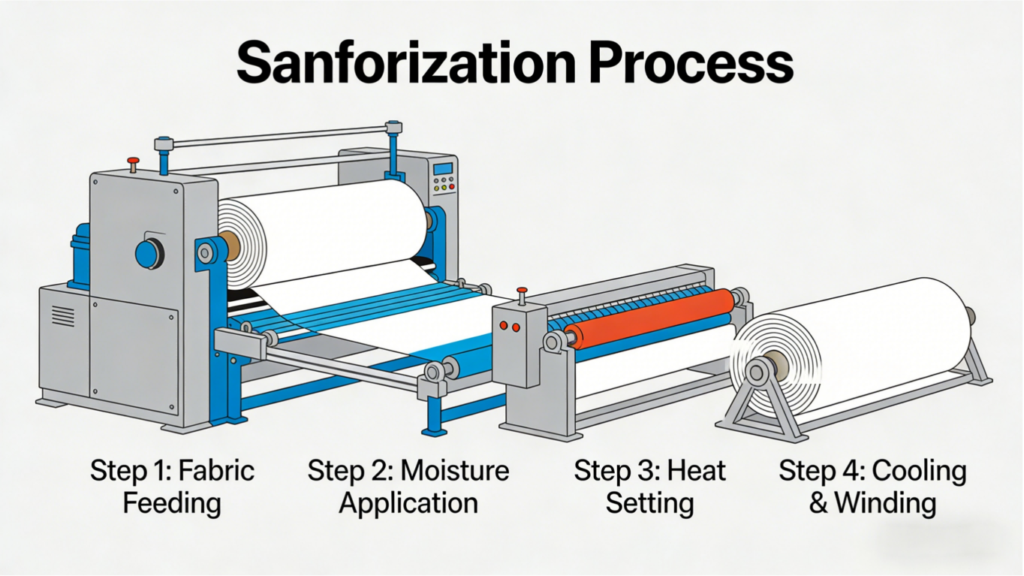 The process works by feeding fabric over a heated cylinder and into a rubber belt/blanket system that mechanically compresses it in the warp direction. The compression percentage is calibrated based on the fabric’s measured shrinkage potential — the goal is to compress by approximately the amount the fabric would otherwise shrink during washing.