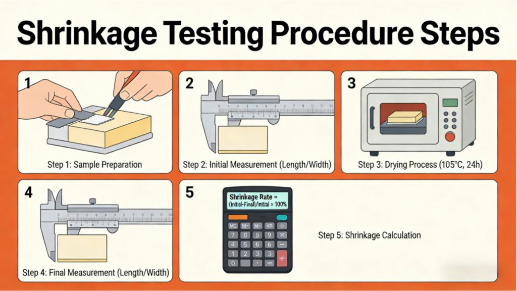 - Calculation: Dimensional change is calculated as a percentage: [(final measurement − original measurement) / original measurement] × 100. A negative value indicates shrinkage; a positive value indicates growth