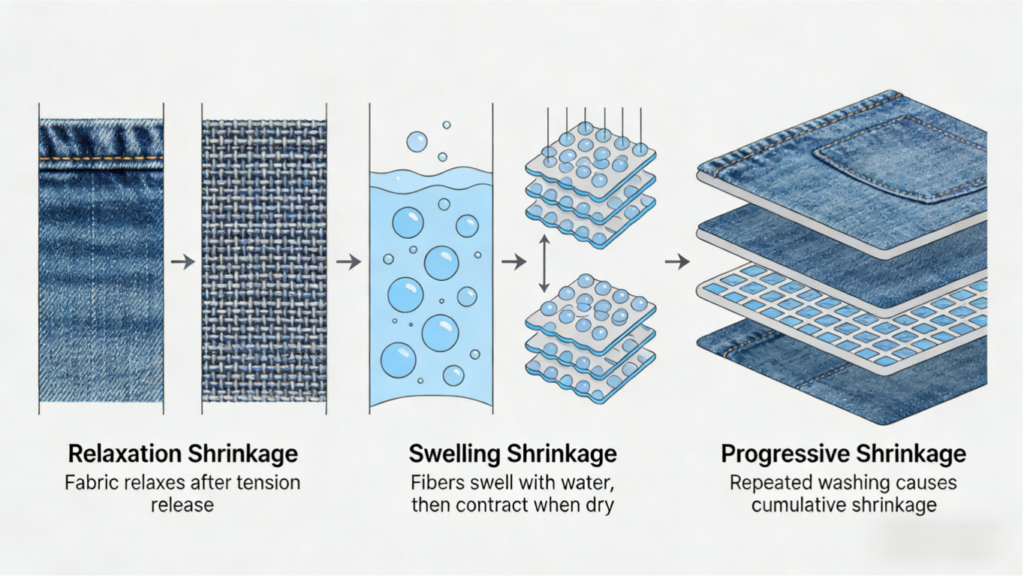Before getting into process and testing details, it helps to understand why denim shrinks in the first place, because the mechanism explains why different fabrics, constructions, and processes produce different results.
